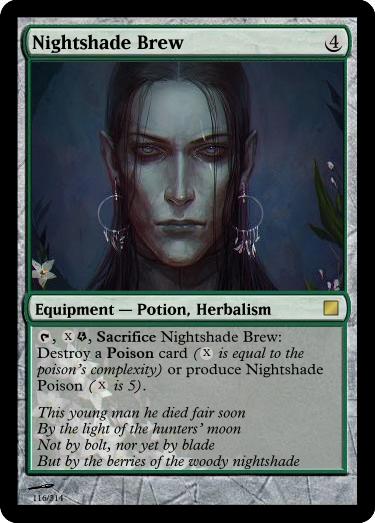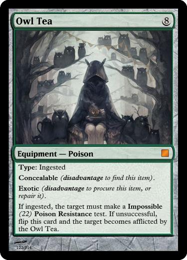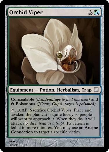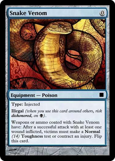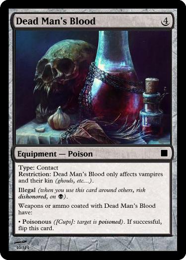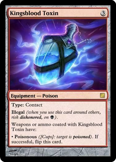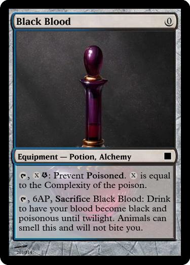 , Sacrifice Vial of Poison: Reveal an ingested Poison Equipment card you have slotted. A copy of it is in the vial ready for immediate use. The poison is well mixed: it has an additional Concealable (disadvantage to find this item) trait.