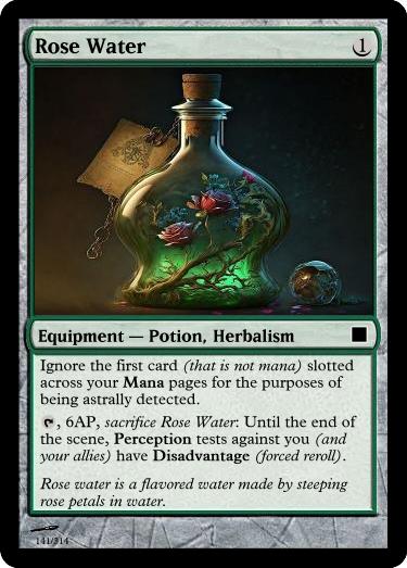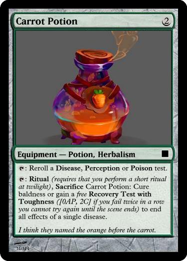 , 6AP, Sacrifice Angelica Ointment: Drink to gain Advantage (free reroll) for Disease tests until twilight.