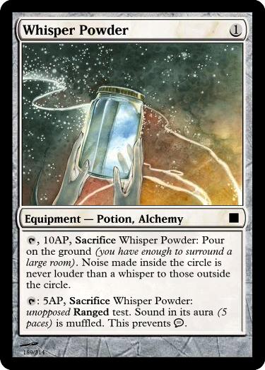 , 10AP, Sacrifice Whisper Powder: Pour on the ground (you have enough to surround a large room). Noise made inside the circle is never louder than a whisper to those outside the circle.