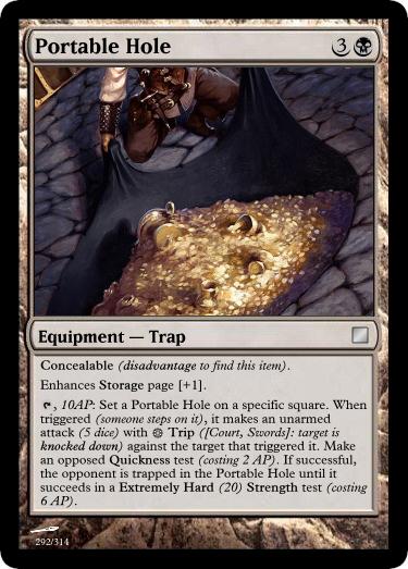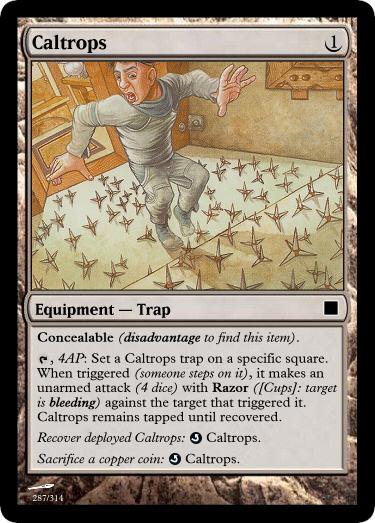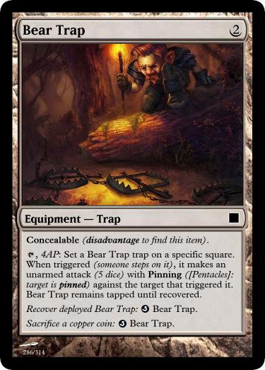 , 4AP: Set a Astral Bear Trap trap on a specific square. When triggered (someone steps on it), it makes an unarmed attack (5 dice) with Pinning ([Pentacles]: target is pinned) against the target that triggered it. Astral Bear Trap remains tapped until recovered.