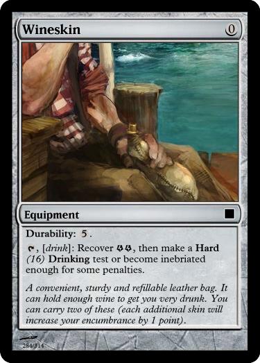 A convenient, sturdy and refillable leather bag. It can hold enough wine to get you very drunk. You can carry two of these (each additional skin will increase your encumbrance by 1 point).