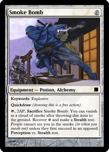 , 5AP, Sacrifice Alchemist Water: Ranged attack (the defender can block or parry, but success forces a durability test for the item). If successful, the target suffers
