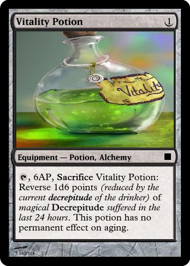 , 6AP, Sacrifice Vitality Potion: Reverse 1d6 points (reduced by the current decrepitude of the drinker) of magical Decrepitude suffered in the last 24 hours. This potion has no permanent effect on aging.