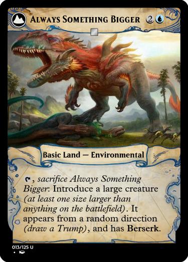 , sacrifice Always Something Bigger: Introduce a large creature (at least one size larger than anything on the battlefield). It appears from a random direction (draw a Trump), and has Berserk.