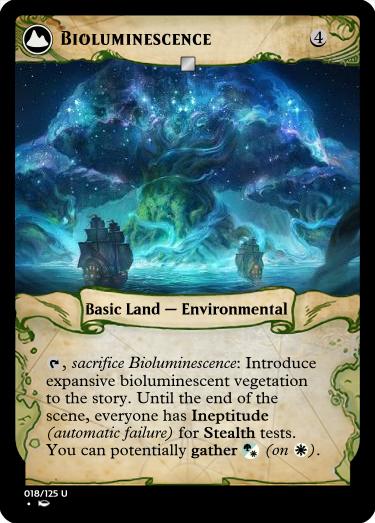 , sacrifice Bioluminescence: Introduce expansive bioluminescent vegetation to the story. Until the end of the scene, everyone has Ineptitude (automatic failure) for Stealth tests. You can potentially gather