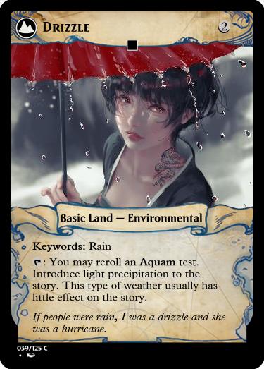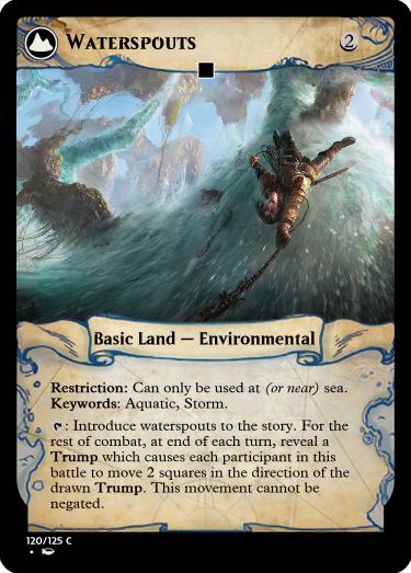 : Introduce waterspouts to the story. For the rest of combat, at end of each turn, reveal a Trump which causes each participant in this battle to move 2 squares in the direction of the drawn Trump. This movement cannot be negated.
