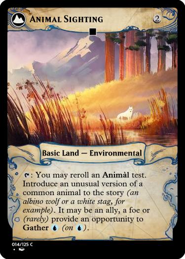 : You may reroll an Animàl test. Introduce an unusual version of a common animal to the story (an albino wolf or a white stag, for example). It may be an ally, a foe or (rarely) provide an opportunity to Gather