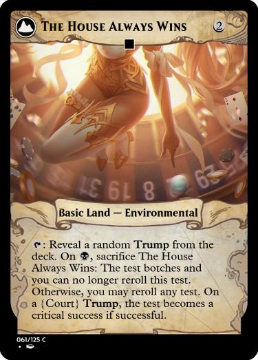 , sacrifice The House Always Wins: The test botches and you can no longer reroll this test. Otherwise, you may reroll any test. On a {Court} Trump, the test becomes a critical success if successful.