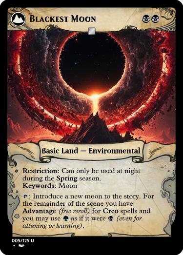 : Introduce a new moon to the story. For the remainder of the scene you have Advantage (free reroll) for Creo spells and you may use